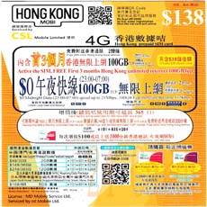 HK Mobile 4G 3月卡 100GB無限+200MIN